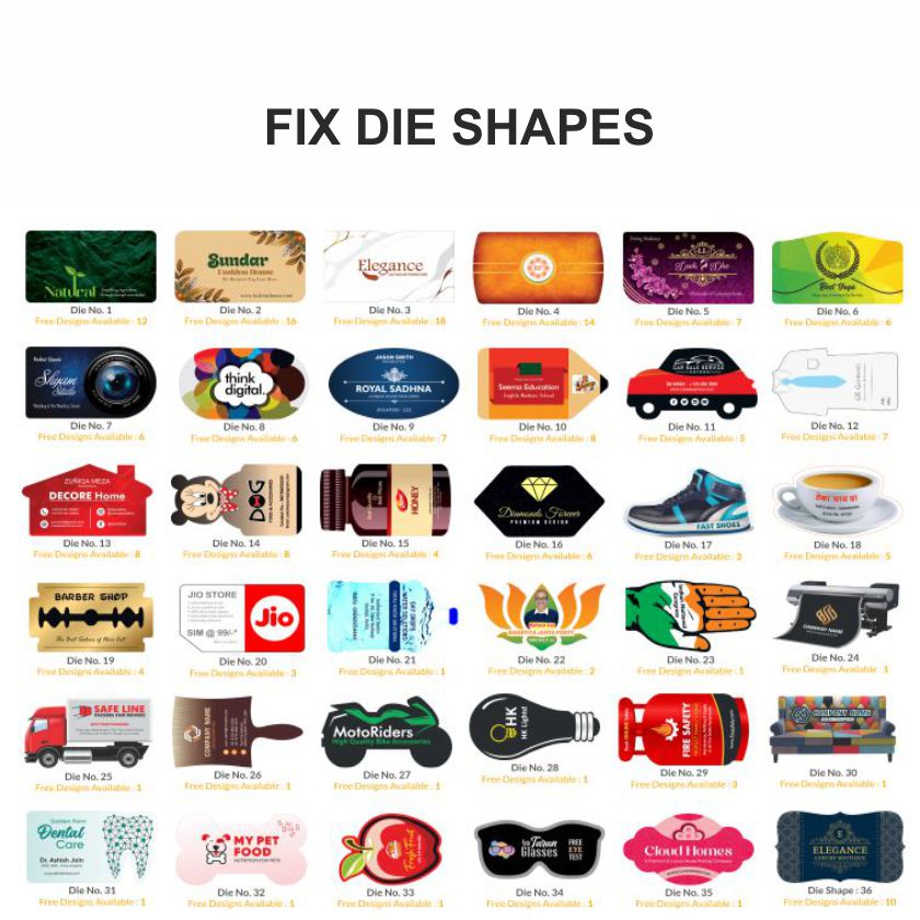 36 fixed Die Cut shapes available hain. Custom shape bhi banaya ja sakta hai.