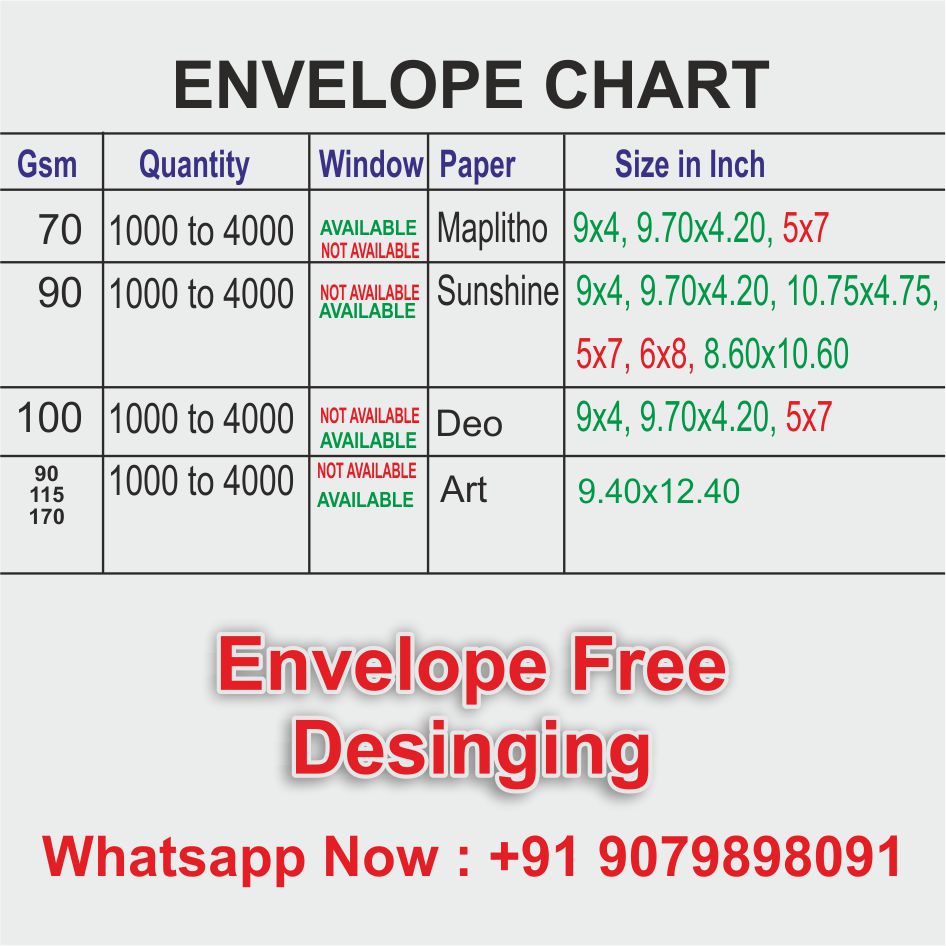 Maplitho 70 GSM is economical and suitable for bulk mailing. Sunshine 90 GSM offers better brightness and strength. DEO 100 GSM provides a premium and durable envelope finish.